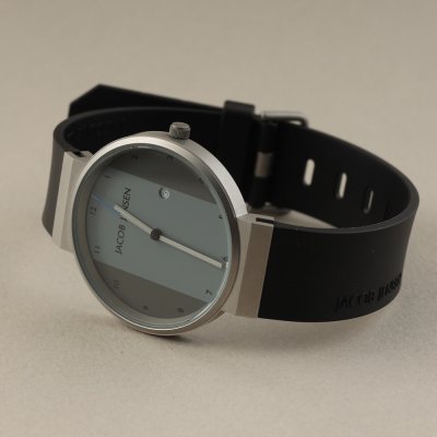 Cette montre Jacob Jensen a un boîtier Inox 35 mm en diamètre et est équipée d'un bracelet caoutchouc.