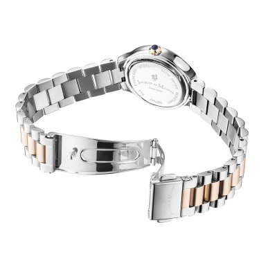 Cette montre Jacques du Manoir a un boîtier Inox 29 mm en diamètre et est équipée d'un bracelet Inox. Le boîtier contient un mouvement Ronda et la montre est dotée d'un cristal Minéral..