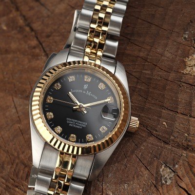 Cette montre Jacques du Manoir a un boîtier Inox 26 mm en diamètre et est équipée d'un bracelet Inox. Le boîtier contient un mouvement Ronda et la montre est dotée d'un cristal Minéral..