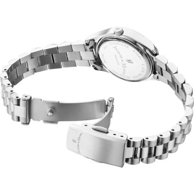 Cette montre Jacques du Manoir a un boîtier Inox 26.5 mm en diamètre et est équipée d'un bracelet Inox. Le boîtier contient un mouvement Ronda et la montre est dotée d'un cristal Minéral..