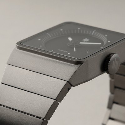Le père du design français moderne, Roger Tallon, a conçu la série de montres Lip Big TV dans les années quatre-vingt-dix. Le solide boîtier carré et le bracelet robuste donnent à la montre une touche rétro, tandis que les détails du design, tels que la couronne, le logo et le cadran en creux, ont un attrait intemporel et moderne indéniable. Cette dernière addition à la famille Lip Big TV est une réinterprétation contemporaine avec un mouvement à remontage automatique et un boîtier entièrement en titane. L'alliage lui confère des lignes sobres et pures, tout en conservant le design du modèle original. La version squelette de cette montre est dotée d'un mouvement de couleur titane, que l'on peut admirer à travers le fond transparent.