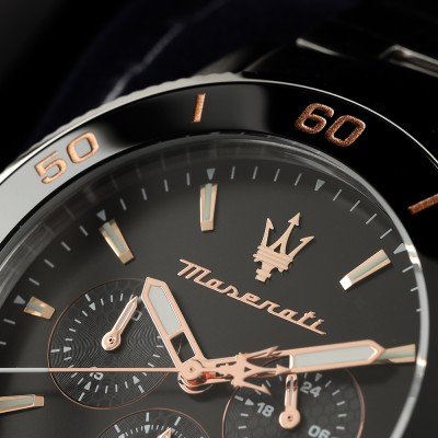 Cette montre Maserati a un boîtier Inox 43 mm en diamètre et est équipée d'un bracelet Inox. Le boîtier contient un mouvement Miyota et la montre est dotée d'un cristal Minéral..