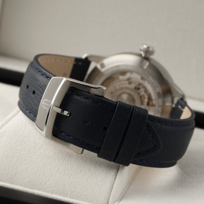 La montre Automatic Vagues du Jura fait partie de la collection 1975 de Maurice Lacroix, qui célèbre son 75e anniversaire. Il s'agit d'une édition limitée à 888 pièces qui rend hommage au siège de l'entreprise dans les Franches-Montagnes et à la manufacture de Saignelégier. Le cadran rend hommage à son lieu d'origine avec un motif Vagues du Jura. Ce motif complexe, qui a été utilisé pour la première fois sur un modèle Masterpiece, représente les collines qui surplombent la Manufacture. La couleur Bleu Saignelégier, propre à Maurice Lacroix, fait référence à l'histoire de la marque. A 3 heures, la date est indiquée par une combinaison de chiffres blancs sur un disque bleu assorti à la teinte principale du cadran. La montre est animée par un calibre automatique ML155 doté d'une réserve de marche de 56 heures, visible à travers le verre saphir et le fond gravé du boîtier. Ce mouvement est plus fin que celui du modèle standard de 1975, ce qui permet à la montre de ne mesurer que 9 mm d'épaisseur. D'autres raffinements du mouvement comprennent le perlage, le colimaçon et une masse oscillante qui est à nouveau ornée des Vagues du Jura ; des détails qui font de ce modèle un modèle spécial. La 1975 Automatic est portée sur un bracelet en cuir bleu Saignelégier assorti, avec le système Maurice Lacroix Easy Strap Exchange.