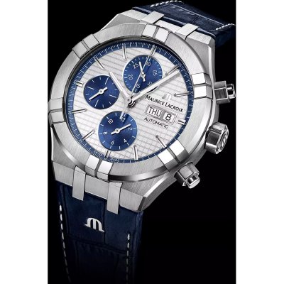Cette montre Maurice Lacroix a un boîtier Inox 44 mm en diamètre et est équipée d'un bracelet cuir. Le boîtier contient un mouvement Sellita et la montre est dotée d'un cristal Saphire..