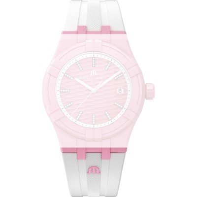 Ce bracelet de montre Maurice Lacroixest fait de caoutchouc et est attaché à la montre au moyen de Épingles à ressort à dégagement rapide. Le bracelet a une taille de 25 mm et se ferme au moyen d'un boucle. Le bracelet n'a pas de support droit, ce qui signifie que ce bracelet convient uniquement aux montres énumérées ci-dessous.