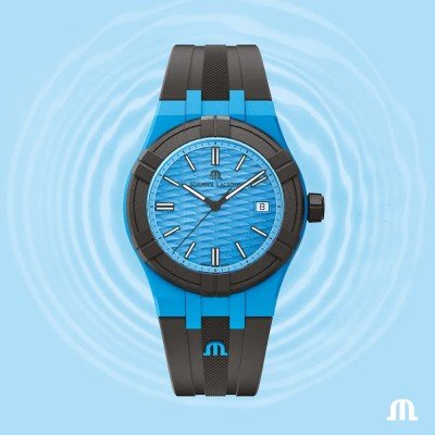 Cette montre Maurice Lacroix a un boîtier Marée plastique océanique 40 mm en diamètre et est équipée d'un bracelet caoutchouc. Le boîtier contient un mouvement Ronda et la montre est dotée d'un cristal Saphire double antireflet..