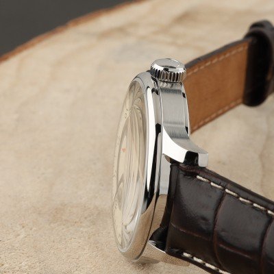 Cette montre Meistersinger a un boîtier Inox 38 mm en diamètre et est équipée d'un bracelet cuir. Le boîtier contient un mouvement Sellita et la montre est dotée d'un cristal Saphire..