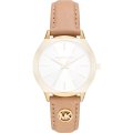 Ce bracelet de montre Michael Korsest fait de cuir et est attaché à la montre au moyen de Épingles à ressort. Le bracelet a une taille de 18 mm et se ferme au moyen d'un boucle. Le bracelet est doté d'une monture droite, ce qui signifie qu'il convient à toutes les montres de la Michael Kors dotées d'une monture droite..