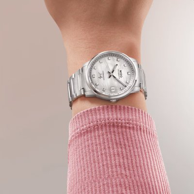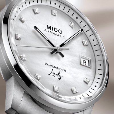 La série Commander de MIDO a été créée en 1995 et est depuis lors au cœur de leur collection. La Commander Lady est une version féminine de ce classique MIDO, presque minimaliste dans son approche, avec une attention toute particulière aux détails. Un boîtier rond avec une lunette fine et une échelle des minutes biseautée ouvre le cadran avec 11 index en diamants véritables (pour un total de 0,0418ct). Les détails noirs confèrent aux aiguilles définition et clarté, tandis que la couronne discrète et intégrée veille à ce que rien ne détourne l'attention de l'objectif principal. Animée par un mouvement suisse ETA avec 72 heures de réserve de marche, la MIDO Commander Lady est à la fois robuste et élégante.