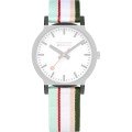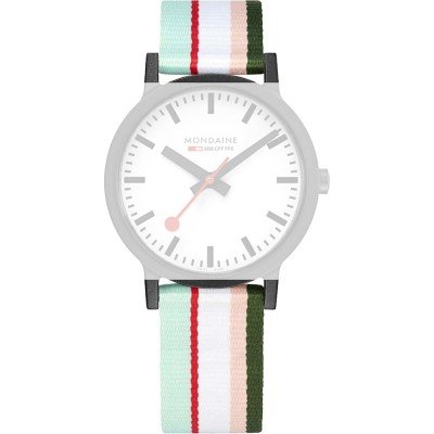 Ce bracelet de montre Mondaineest fait de textile et est attaché à la montre au moyen de Épingles à ressort à dégagement rapide. Le bracelet a une taille de 20 mm et se ferme au moyen d'un boucle. Le bracelet est doté d'une monture droite, ce qui signifie qu'il convient à toutes les montres de la Mondaine dotées d'une monture droite..
