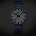 Cette montre Mondaine a un boîtier Inox 40 mm en diamètre et est équipée d'un bracelet Inox. Le boîtier contient un mouvement Ronda et la montre est dotée d'un cristal Minéral durci..