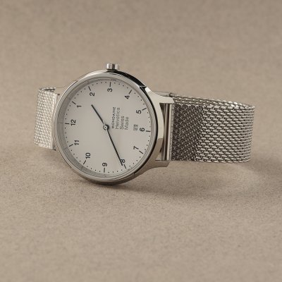 Cette montre Mondaine a un boîtier Inox 40 mm en diamètre et est équipée d'un bracelet métal. Le boîtier contient un mouvement Ronda et la montre est dotée d'un cristal Saphire..