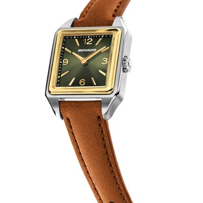 La collection Movado Heritage s'inspire de la riche histoire de la marque et remet au goût du jour les montres d'époque. L'élégance géométrique de l'Art déco se reflète dans les montres "Heritage 1917". Célébrant et réinventant les premières montres Movado carrées de 1917, cette montre possède un boîtier de forme aux lignes clairement définies et à l'allure architecturale. Les mises à jour contemporaines de l'original sont un bracelet unilink nouvellement conçu ou un riche bracelet en cuir tanné italien d'inspiration vintage, ainsi qu'un cadran ombré soleil, avec de subtiles variations de tons, faisant écho à une ligne d'horizon Deco. Le mouvement automatique suisse Sellita SW200, doté d'un rotor au design Deco personnalisé, présente des aiguilles douces et dynamiques et est visible à travers un fond de boîtier en verre saphir.