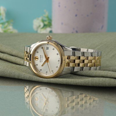Cette magnifique montre Movado classique bicolore pour femmes présente 10 index en diamants véritables et une lunette cannelée brillante.