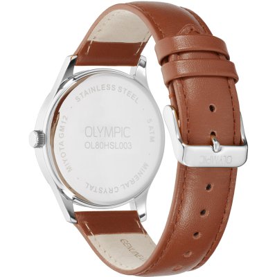 Cette montre Olympic a un boîtier Inox 40 mm en diamètre et est équipée d'un bracelet cuir. Le boîtier contient un mouvement Miyota et la montre est dotée d'un cristal Minéral..