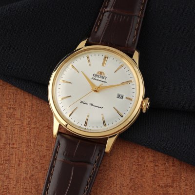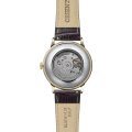Cette montre Orient a un boîtier Inox 40 mm en diamètre et est équipée d'un bracelet cuir. Le boîtier contient un mouvement Orient et la montre est dotée d'un cristal Minéral..