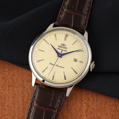 Cette montre Orient a un boîtier Inox 40 mm en diamètre et est équipée d'un bracelet cuir. Le boîtier contient un mouvement Orient et la montre est dotée d'un cristal Minéral..