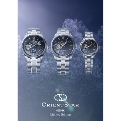 "Keshiki" signifie en japonais "beaux paysages", ce qui, dans cette montre, s'exprime par des couleurs inspirées par les liens entre le ciel et la mer. En outre, le cadran capture une scène où la lumière se reflète sur un sol enneigé, illuminant doucement les environs. Ce résultat est obtenu grâce à un dégradé de bleu profond dans la moitié supérieure du cadran, conférant à la montre une atmosphère poétique. La montre Keshiki fait partie de la série mécanique contemporaine Orient Star de montres automatiques à cœur ouvert. Elle est limitée à 1000 pièces dans le monde entier et porte un numéro de série individuel gravé sur le fond du boîtier.