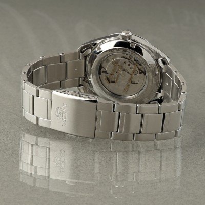 Cette montre Orient a un boîtier Inox 38.5 mm en diamètre et est équipée d'un bracelet Inox. Le boîtier contient un mouvement Orient et la montre est dotée d'un cristal Saphire..