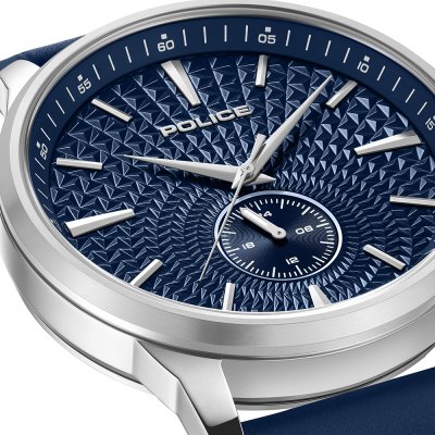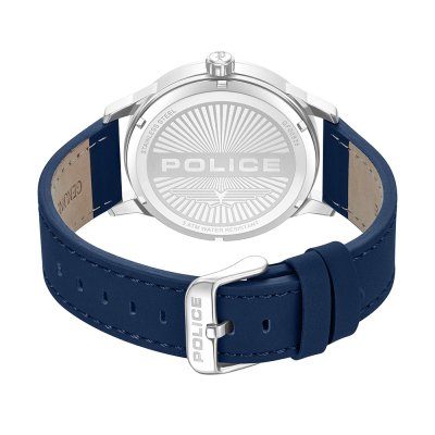 Cette montre Police a un boîtier Inox 44 mm en diamètre et est équipée d'un bracelet cuir. Le boîtier contient un mouvement Seiko et la montre est dotée d'un cristal Minéral..