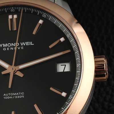 La dernière-née de la gamme Raymond Weil Freelancer allie l'élégance classique au raffinement moderne. La montre est équipée d'un mouvement mécanique à remontage automatique avec une réserve de marche de 41 heures (RW4420). Les cornes du boîtier de 40 mm sont incurvées pour que la montre tienne confortablement au poignet, tout comme le bracelet de style jubilé avec boucle déployante à double poussoir. Les lignes plus serrées de la lunette et la finition polie brillante, ainsi que le cadran soleillé, renforcent la profondeur et le jeu dynamique de la lumière. Les index appliqués et les aiguilles raffinées avec Super-LumiNova blanc assurent une lisibilité optimale, tandis qu'une subtile minuterie positionnée sur la lunette intérieure complète le design harmonieux. La couronne vissée est embossée d'un monogramme RW et le mouvement automatique se dévoile à travers le fond saphir, montrant une masse oscillante en forme de W - signatures distinctives de la marque Raymond Weil.
