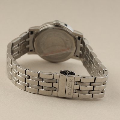 Cette montre Roamer a un boîtier Inox 30 mm en diamètre et est équipée d'un bracelet métal. Le boîtier contient un mouvement Ronda et la montre est dotée d'un cristal Saphire..