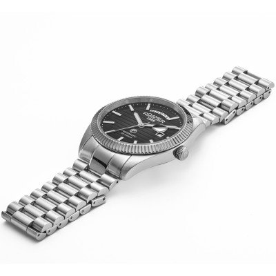 Cette montre Roamer a un boîtier Inox 42 mm en diamètre et est équipée d'un bracelet Inox. Le boîtier contient un mouvement Sellita et la montre est dotée d'un cristal Saphire..