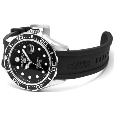 Cette montre Roamer a un boîtier Inox 45 mm en diamètre et est équipée d'un bracelet caoutchouc. Le boîtier contient un mouvement Ronda et la montre est dotée d'un cristal Saphire..