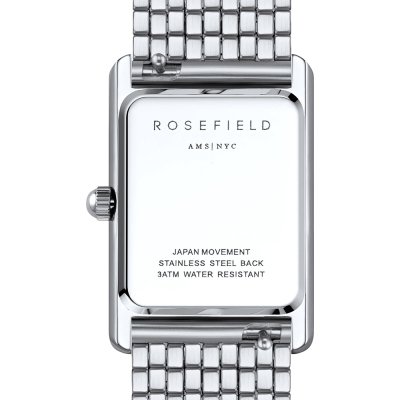 Cette montre Rosefield a un boîtier Alliage de Métal 23 mm en diamètre et est équipée d'un bracelet Inox. Le boîtier contient un mouvement Seiko et la montre est dotée d'un cristal Minéral..