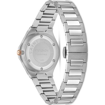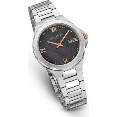 Cette montre Saint Honoré a un boîtier Inox 33 mm en diamètre et est équipée d'un bracelet Inox. Le boîtier contient un mouvement Ronda et la montre est dotée d'un cristal Minéral..