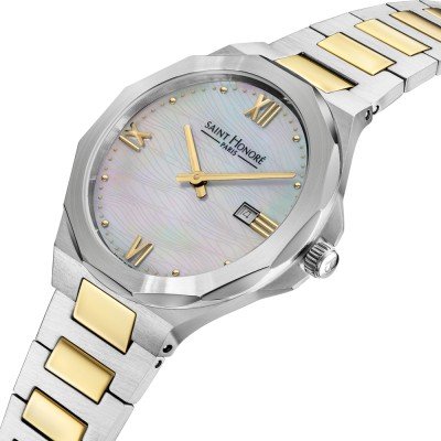 Cette montre Saint Honoré a un boîtier Inox 33 mm en diamètre et est équipée d'un bracelet Inox. Le boîtier contient un mouvement Ronda et la montre est dotée d'un cristal Minéral..