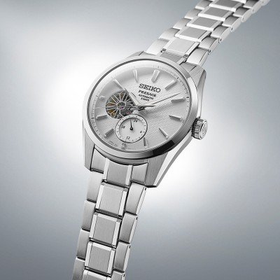 La SPB415J1 vient compléter la série Presage Sharp-Edged. Il s'agit d'une série de montres dotées d'un boîtier aux arêtes vives et d'un cadran traditionnel "Asanoha" à la texture de feuilles de chanvre japonaises. Ce modèle particulier est doté d'un cadran "Shiro" ou blanc, avec un motif pressé tridimensionnel, un revêtement lapidaire et un dégradé de couleurs. Le cadran à cœur ouvert laisse entrevoir le mouvement automatique 6R5J à 24 rubis et 72 heures de réserve de marche. La structure fine du boîtier s'associe à un verre saphir à double courbure et à des aiguilles des secondes incurvées pour une excellente lisibilité.