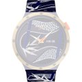 Ce bracelet de montre Swatchest fait de silicone et est attaché à la montre au moyen de goupilles en acier. Le bracelet a une taille de 19.7 mm et se ferme au moyen d'un boucle. Le bracelet n'a pas de support droit, ce qui signifie que ce bracelet convient uniquement aux montres énumérées ci-dessous.