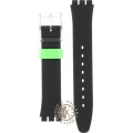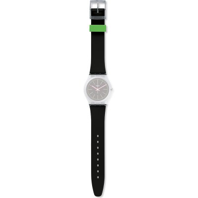 Ce bracelet de montre Swatchest fait de silicone et est attaché à la montre au moyen de goupilles en acier. Le bracelet a une taille de 17 mm et se ferme au moyen d'un boucle. Le bracelet n'a pas de support droit, ce qui signifie que ce bracelet convient uniquement aux montres énumérées ci-dessous.