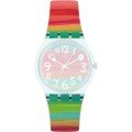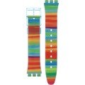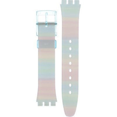 Ce bracelet de montre Swatchest fait de résine et est attaché à la montre au moyen de goupilles en acier. Le bracelet a une taille de 17 mm et se ferme au moyen d'un boucle. Le bracelet n'a pas de support droit, ce qui signifie que ce bracelet convient uniquement aux montres énumérées ci-dessous.