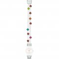 Ce bracelet de montre Swatchest fait de autres / matériaux mixtes et est attaché à la montre au moyen de goupilles en acier. Le bracelet a une taille de 12 mm. Le bracelet n'a pas de support droit, ce qui signifie que ce bracelet convient uniquement aux montres énumérées ci-dessous.