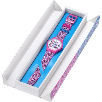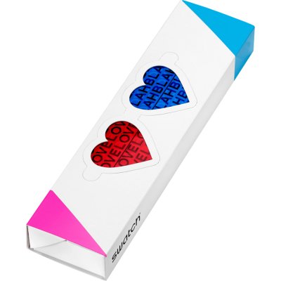 Cette montre spéciale est dotée d’un cadran blanc sur lequel sont imprimés les mots « LOVE » et « BLAH » en rose, noir et bleu. Lorsque vous regardez à travers un verre teinté rouge ou bleu, vous verrez un mot différent sur le cadran.