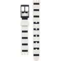 Ce bracelet de montre Swatchest fait de silicone et est attaché à la montre au moyen de goupilles en acier. Le bracelet a une taille de 12 mm et se ferme au moyen d'un boucle. Le bracelet n'a pas de support droit, ce qui signifie que ce bracelet convient uniquement aux montres énumérées ci-dessous.