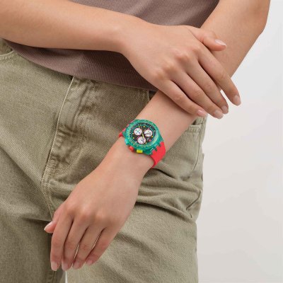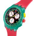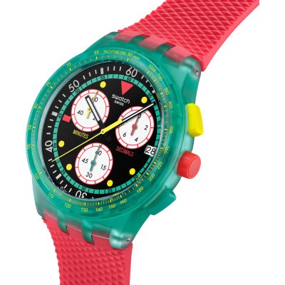 Cette montre Swatch a un boîtier Résine 42 mm en diamètre et est équipée d'un bracelet caoutchouc. Le boîtier contient un mouvement ETA et la montre est dotée d'un cristal Acrylique..