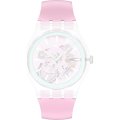 Ce bracelet de montre Swatchest fait de caoutchouc / Silicone et est attaché à la montre au moyen de goupilles en acier. Le bracelet a une taille de 19.7 mm et se ferme au moyen d'un boucle. Le bracelet n'a pas de support droit, ce qui signifie que ce bracelet convient uniquement aux montres énumérées ci-dessous.