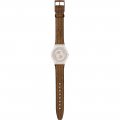 Ce bracelet de montre Swatchest fait de cuir et est attaché à la montre au moyen de goupilles en acier. Le bracelet a une taille de 16.5 mm et se ferme au moyen d'un boucle. Le bracelet n'a pas de support droit, ce qui signifie que ce bracelet convient uniquement aux montres énumérées ci-dessous.