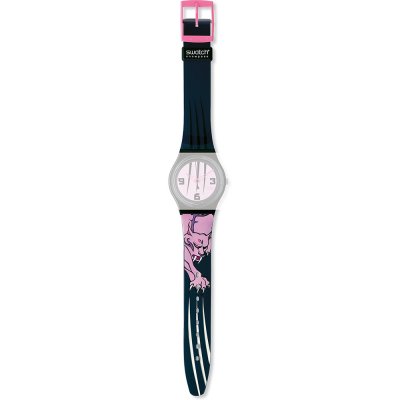 Ce bracelet de montre Swatchest fait de résine et est attaché à la montre au moyen de goupilles en acier. Le bracelet a une taille de 17 mm et se ferme au moyen d'un boucle. Le bracelet n'a pas de support droit, ce qui signifie que ce bracelet convient uniquement aux montres énumérées ci-dessous.