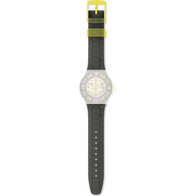 Ce bracelet de montre Swatchest fait de silicone et est attaché à la montre au moyen de goupilles en acier. Le bracelet a une taille de 21.3 mm et se ferme au moyen d'un boucle. Le bracelet n'a pas de support droit, ce qui signifie que ce bracelet convient uniquement aux montres énumérées ci-dessous.