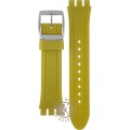Ce bracelet de montre Swatchest fait de silicone et est attaché à la montre au moyen de goupilles en acier. Le bracelet a une taille de 19.7 mm et se ferme au moyen d'un boucle. Le bracelet n'a pas de support droit, ce qui signifie que ce bracelet convient uniquement aux montres énumérées ci-dessous.
