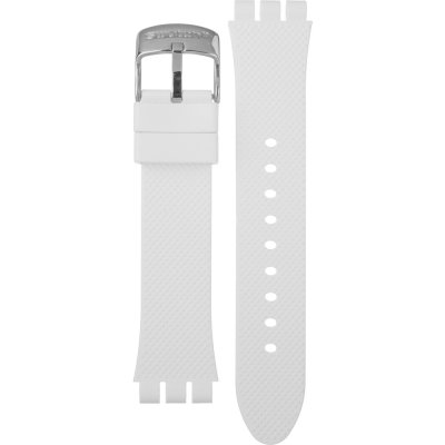 Ce bracelet de montre Swatchest fait de silicone et est attaché à la montre au moyen de goupilles en acier. Le bracelet a une taille de 19.7 mm et se ferme au moyen d'un boucle. Le bracelet n'a pas de support droit, ce qui signifie que ce bracelet convient uniquement aux montres énumérées ci-dessous.