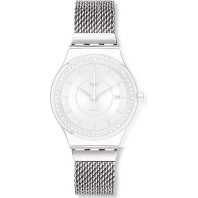 Ce bracelet de montre Swatchest fait de acier inoxydable et est attaché à la montre au moyen de goupilles en acier. Le bracelet a une taille de 19.6 mm et se ferme au moyen d'un boucle papillon Invisible. Le bracelet n'a pas de support droit, ce qui signifie que ce bracelet convient uniquement aux montres énumérées ci-dessous.