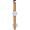 Ce bracelet de montre Swatchest fait de cuir et est attaché à la montre au moyen de goupilles en acier. Le bracelet a une taille de 21 mm et se ferme au moyen d'un boucle. Le bracelet n'a pas de support droit, ce qui signifie que ce bracelet convient uniquement aux montres énumérées ci-dessous.