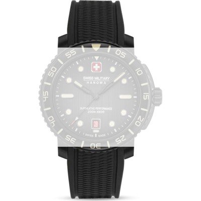 Ce bracelet de montre Swiss Military Hanowaest fait de silicone et est attaché à la montre au moyen de Épingles à ressort. Le bracelet a une taille de 22 mm et se ferme au moyen d'un boucle. Le bracelet n'a pas de support droit, ce qui signifie que ce bracelet convient uniquement aux montres énumérées ci-dessous.