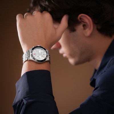 Cette montre Swiss Military Hanowa a un boîtier Inox 42 mm en diamètre et est équipée d'un bracelet Inox. Le boîtier contient un mouvement Ronda et la montre est dotée d'un cristal Saphire..