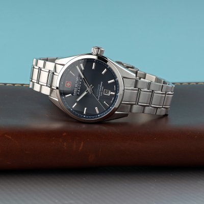 Cette montre Swiss Military Hanowa a un boîtier Inox 41 mm en diamètre et est équipée d'un bracelet Inox. Le boîtier contient un mouvement Soprod et la montre est dotée d'un cristal Saphire..